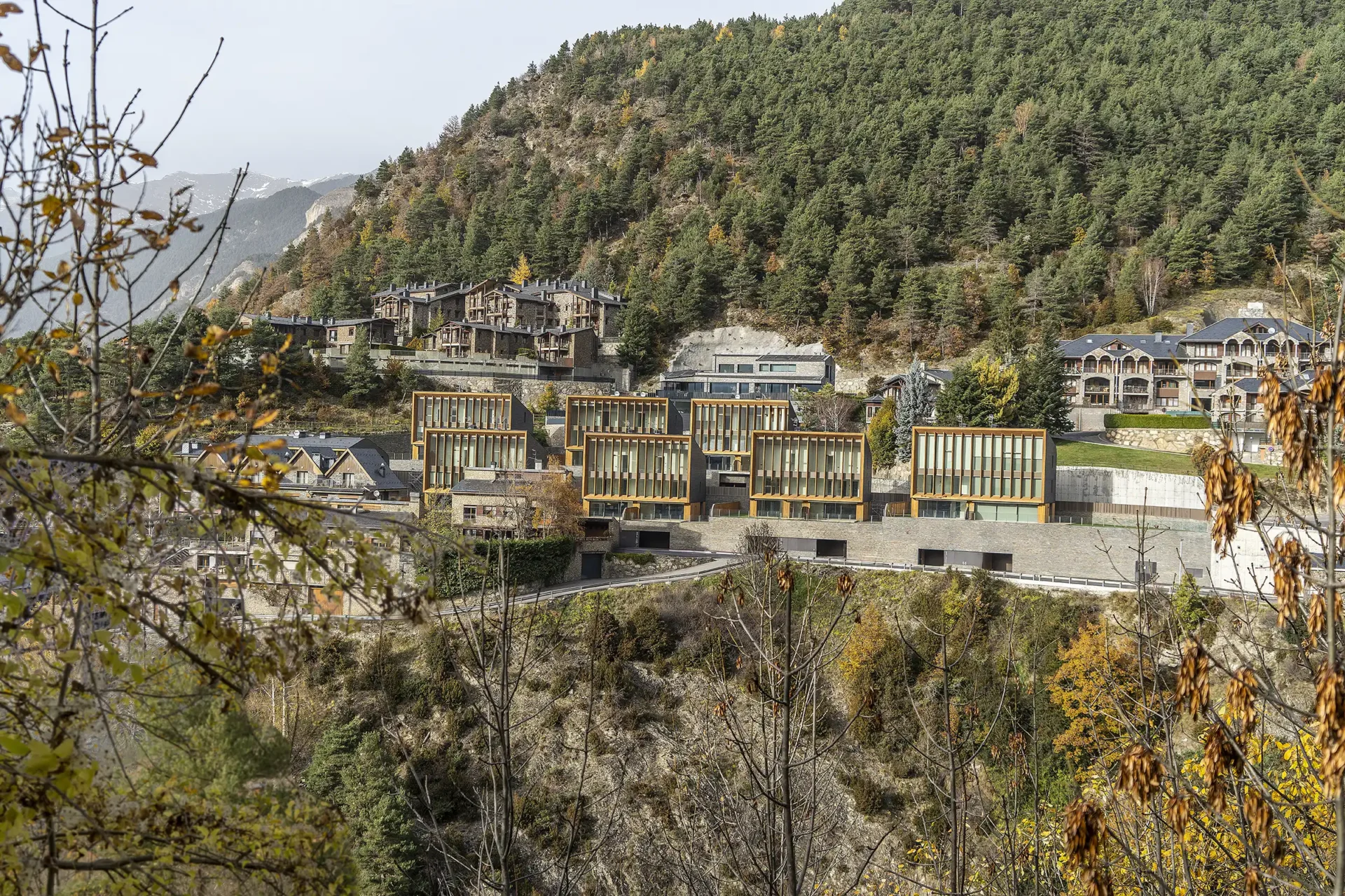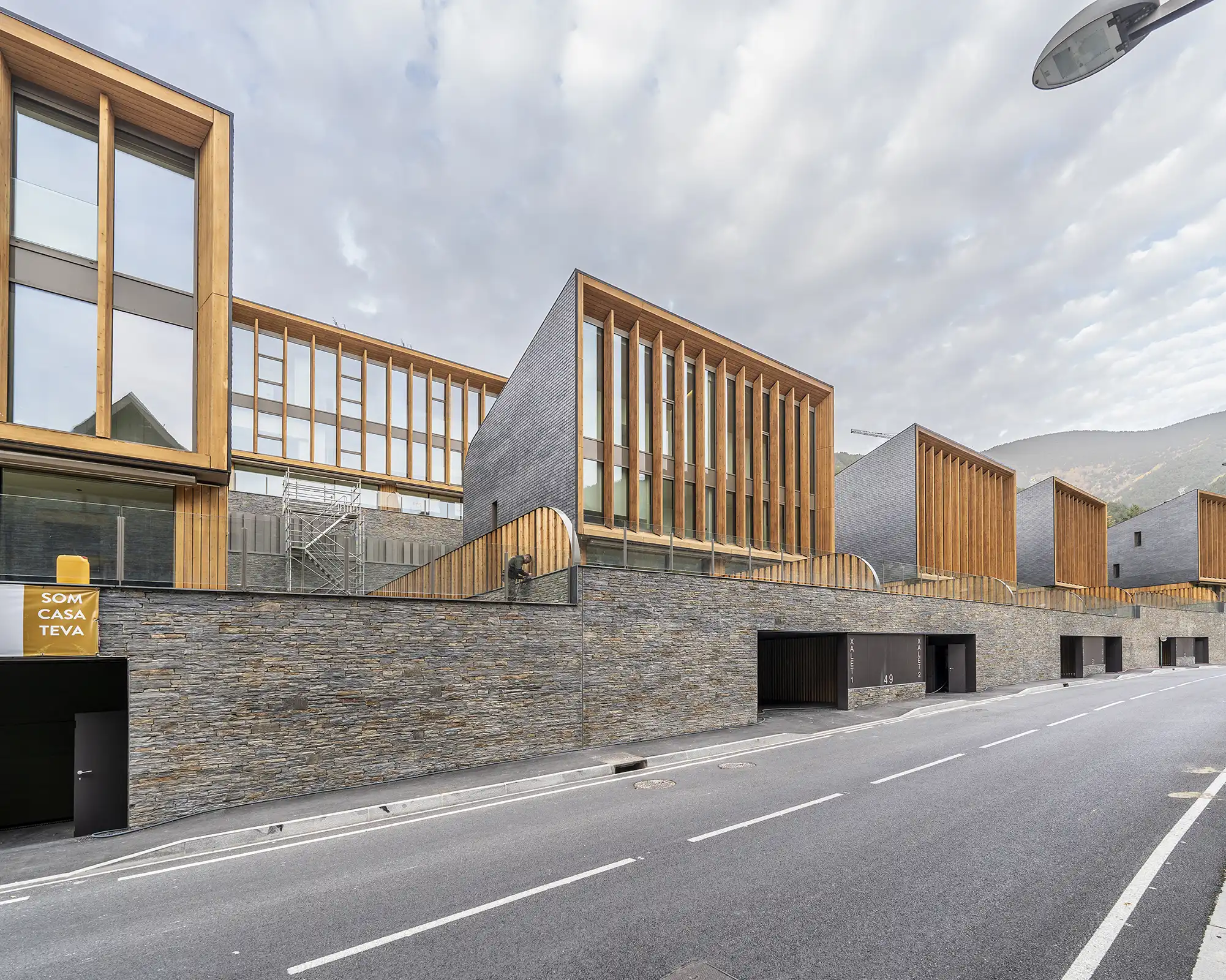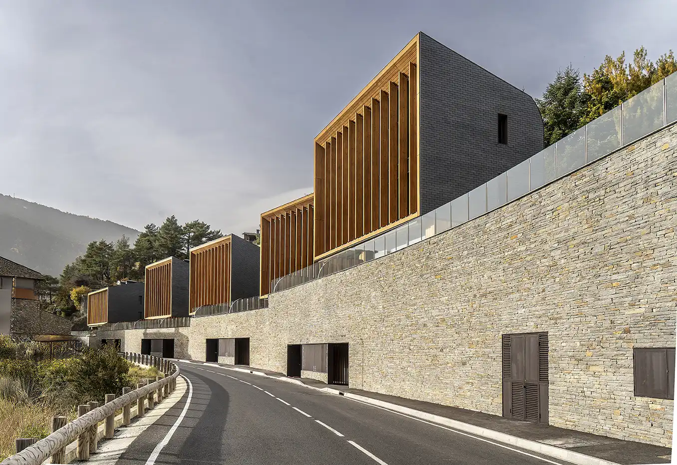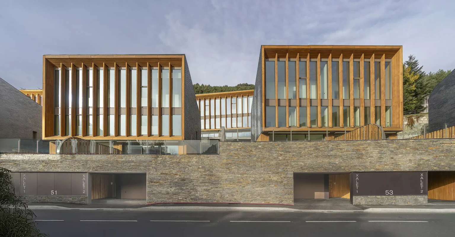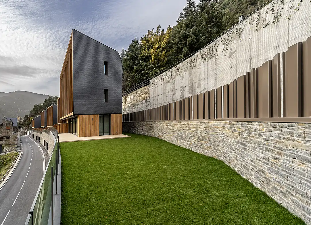 El mur de pedra natural esdevé un element essencial en el projecte Aldosa Village, aportant solidesa, caràcter i una integració harmoniosa amb el paisatge d’Andorra. La seva disposició segueix la topografia del terreny, generant continuïtat visual i reforçant el diàleg amb l’entorn. La pedra, seleccionada per la seva qualitat i tonalitat, contribueix també a l’eficiència tèrmica i a la durabilitat de l’edificació. Aquest element constructiu combina tradició i contemporaneïtat, convertint-se en una peça clau dins d’una arquitectura que busca equilibri, autenticitat i respecte pel medi natural.